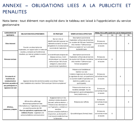 Les obligations doivent être mises en œuvre dès le début des opérations. Leur application est vérifiée lors des visites sur place, des contrôles de service fait et des éventuels audits. En cas de carence, les porteurs de projet s’exposent à des sanctions financières pouvant aller jusqu’à 3% des montants conventionnés.