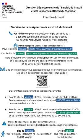 Le service de renseignements en droit du travail de la DDETS du Morbihan est un service public qui donne des informations juridiques générales relatives au Code du travail, aux conventions et accords collectifs et à la jurisprudence sociale.