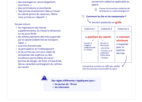 Le code du travail numérique vous indique les montants applicables selon la catégorie professionnelle du salarié, sa position et son coefficient, pour les branches professionnelles les plus importantes.